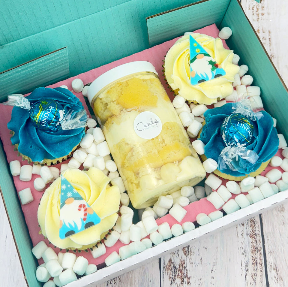 Our Christmas Treat Box brings the magic home — a white chocolate Malteser cake-in-a-jar, festive Gonkmas Cupcakes, and indulgent Salted Caramel Lindt Cupcakes.