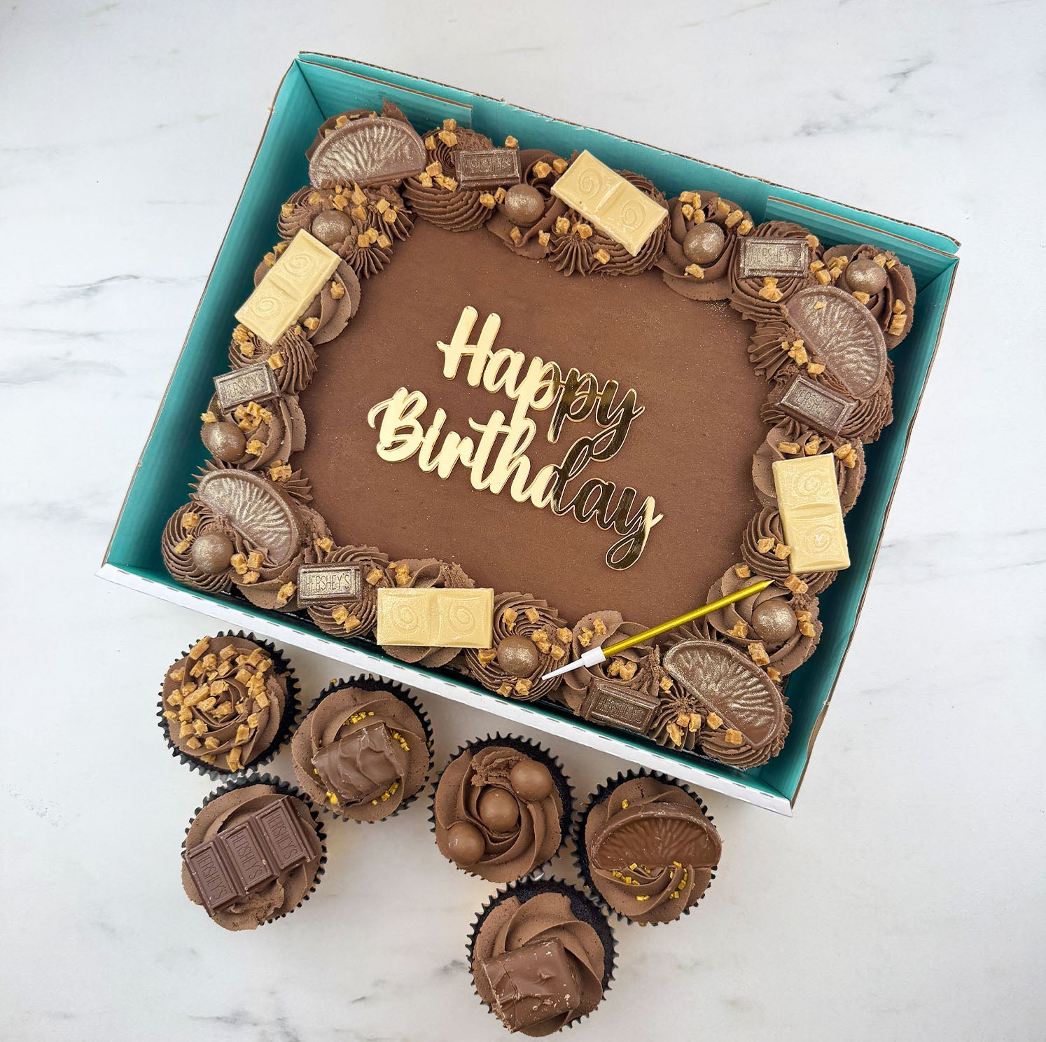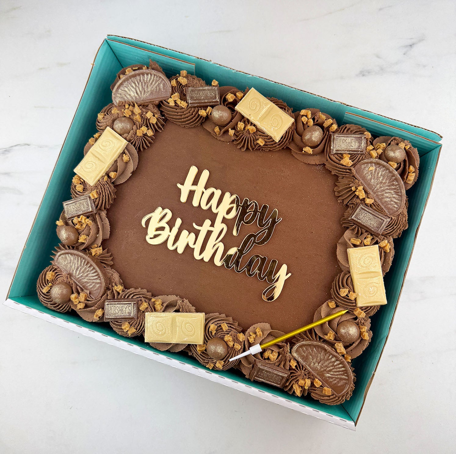 Our moist chocolate sponge sheet cake is covered with hand-piped chocolate buttercream and topped with Chocolate Orange segments, Hershey’s, Caramilk, Maltesers, Fudge Pieces and golden crunch sprinkles.