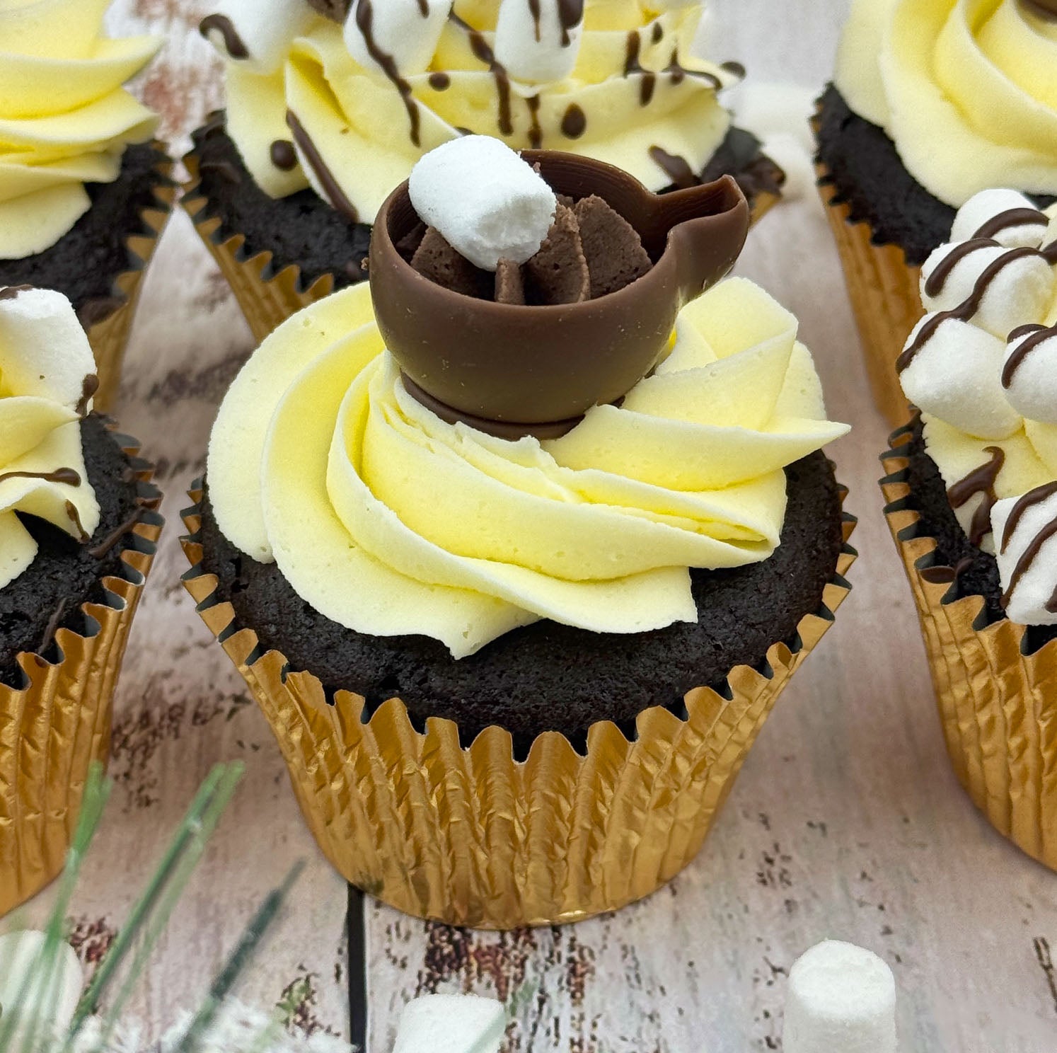 - 3x Cupcakes topped with mini chocolate cups filled with chocolate buttercream & a marshmallow (per 6 cupcakes)