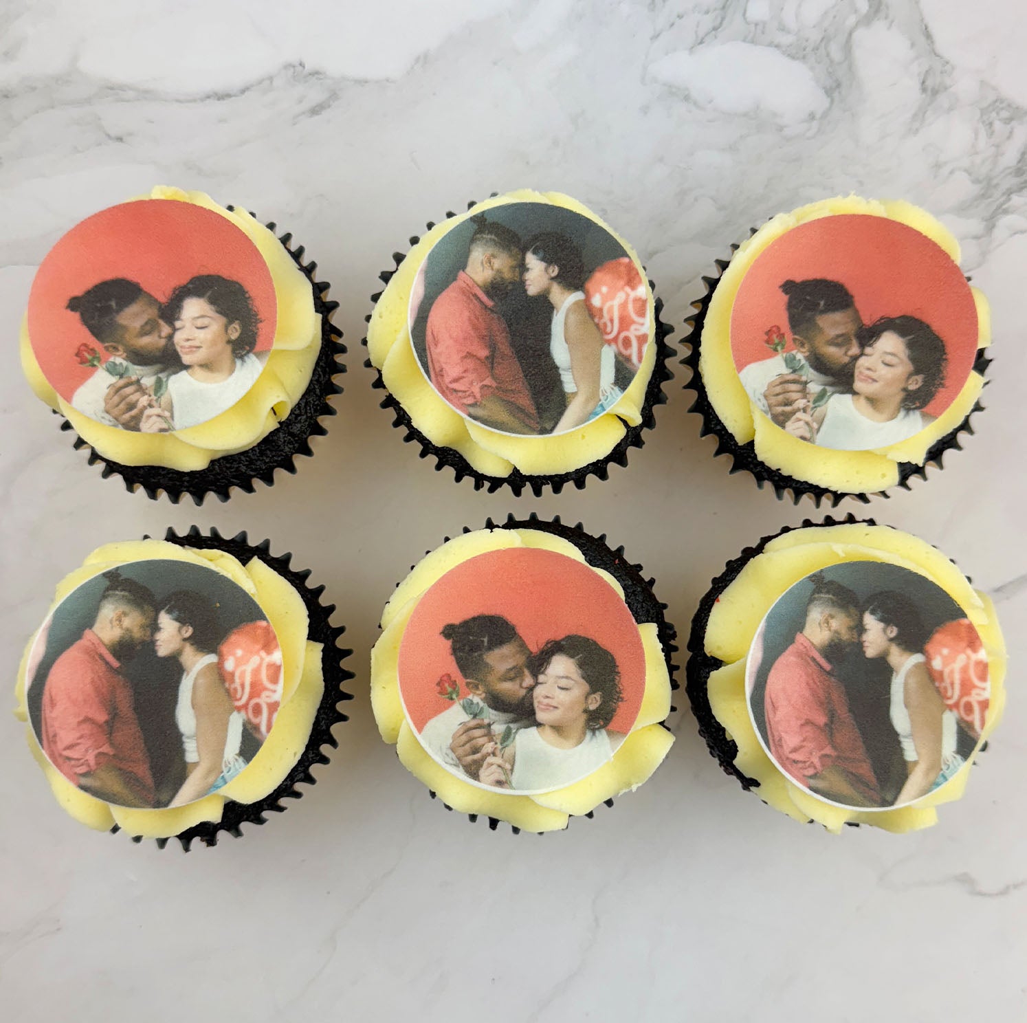 - All cupcakes are topped with a buttercream swirl and a printed photo on an edible wafer card