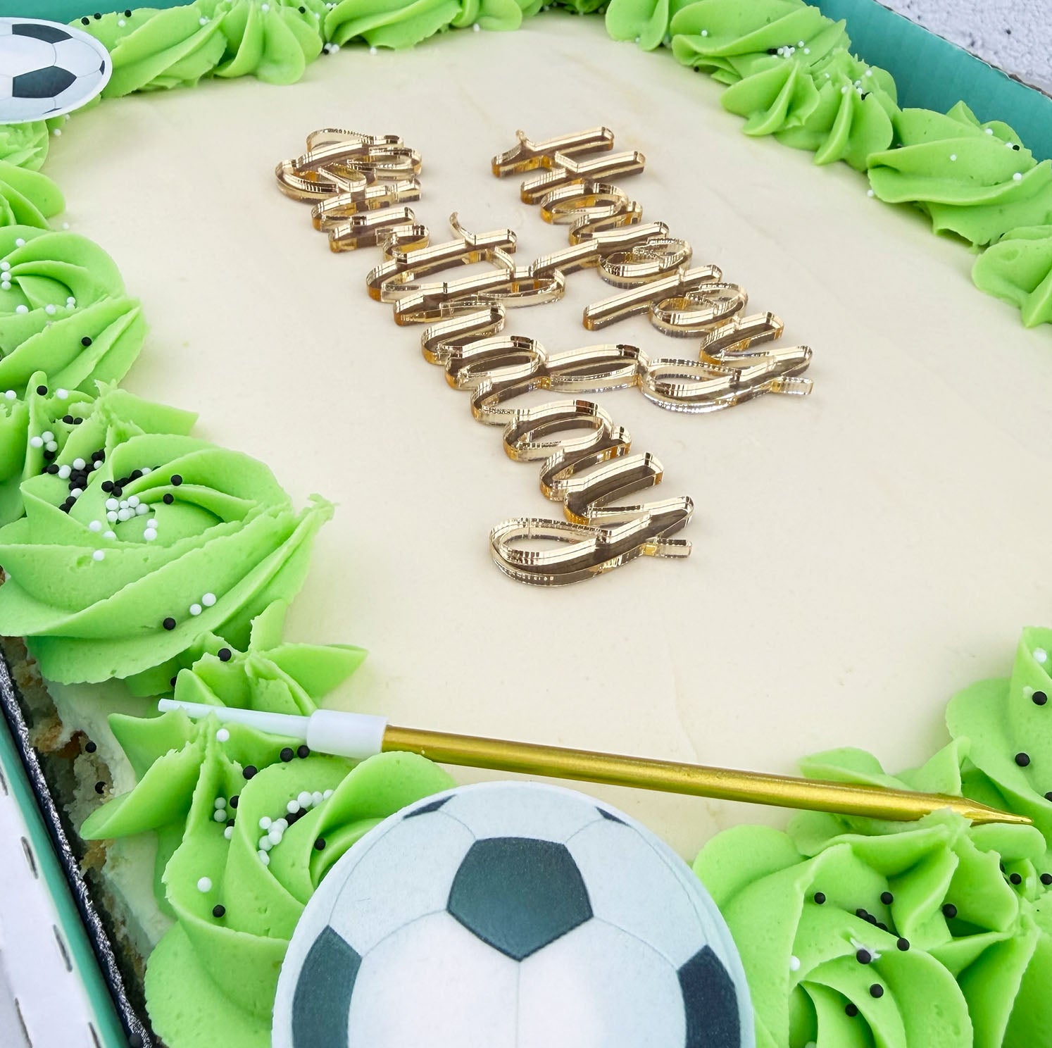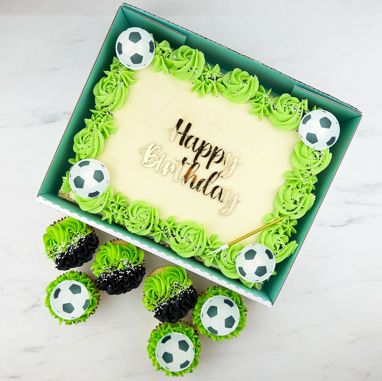 Our football pitch-themed cake is made from a freshly baked sponge, with hand-piped grass-green vanilla buttercream swirls, edible football images, and sprinkles.