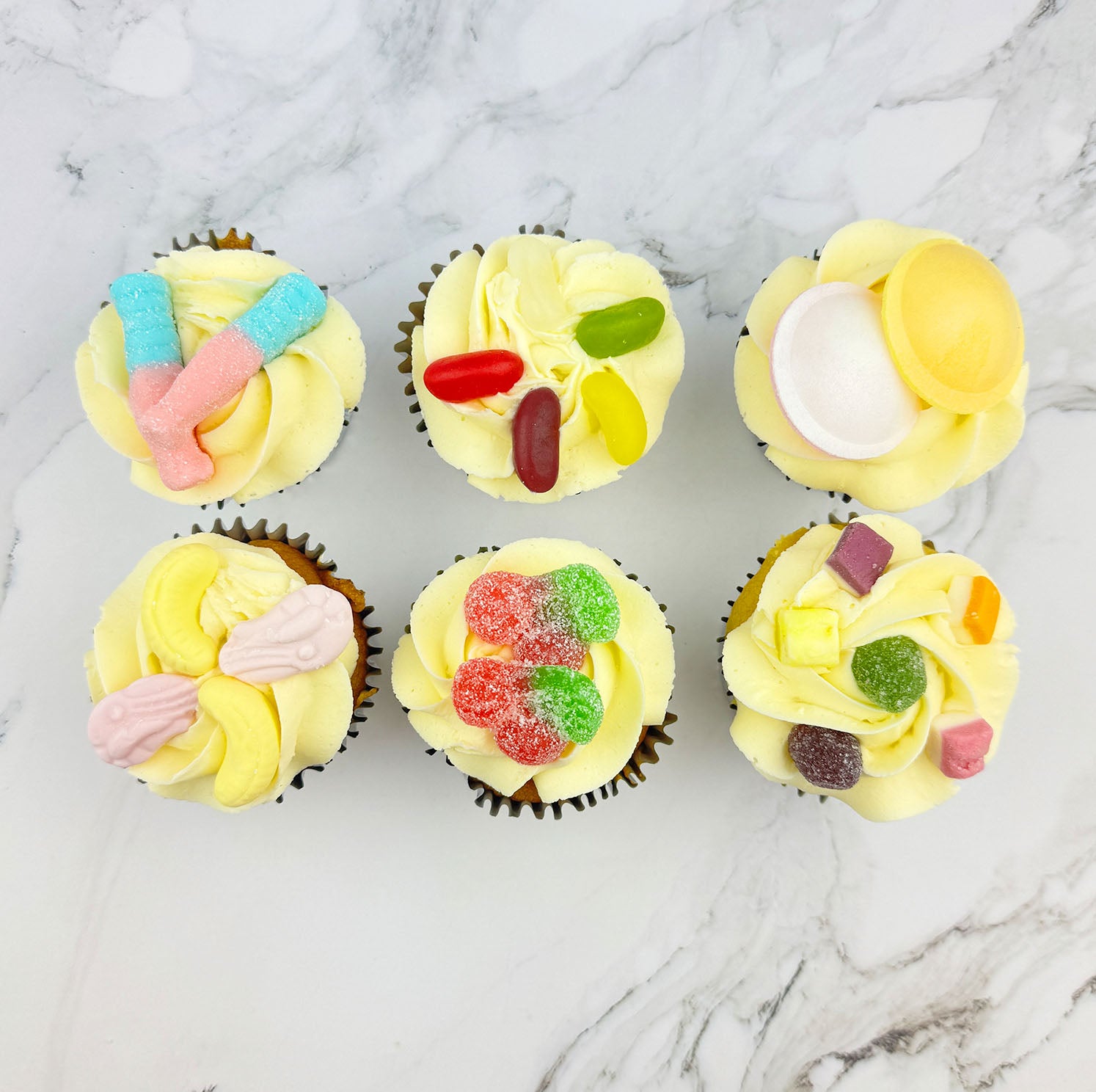 - 1x Fizzy Cherries, 1x Foam Banana & Shrimp, 1x Blue Bottle sweets, 1x Jelly Beans, 1x Flying Saucers, 1x Dolly Mixture (per 6 cupcakes)