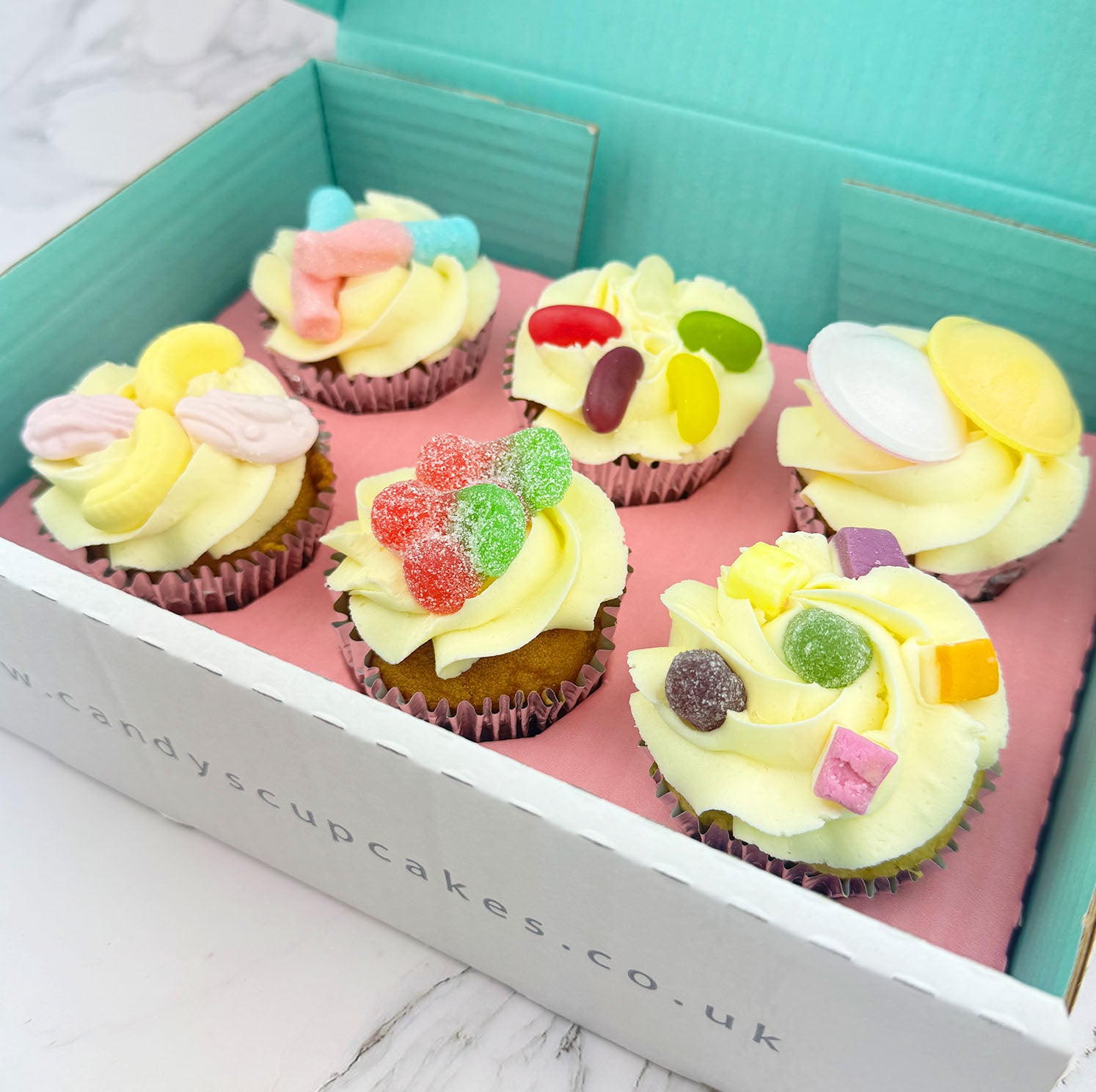 Celebrate with freshly baked handmade gluten-free vanilla cupcakes, topped with smooth whipped vanilla buttercream and a selection of Fizzy Cherries, Foam Banana & Shrimp, Blue Bottle sweets, Jelly Beans, Flying Saucers and Dolly Mixture