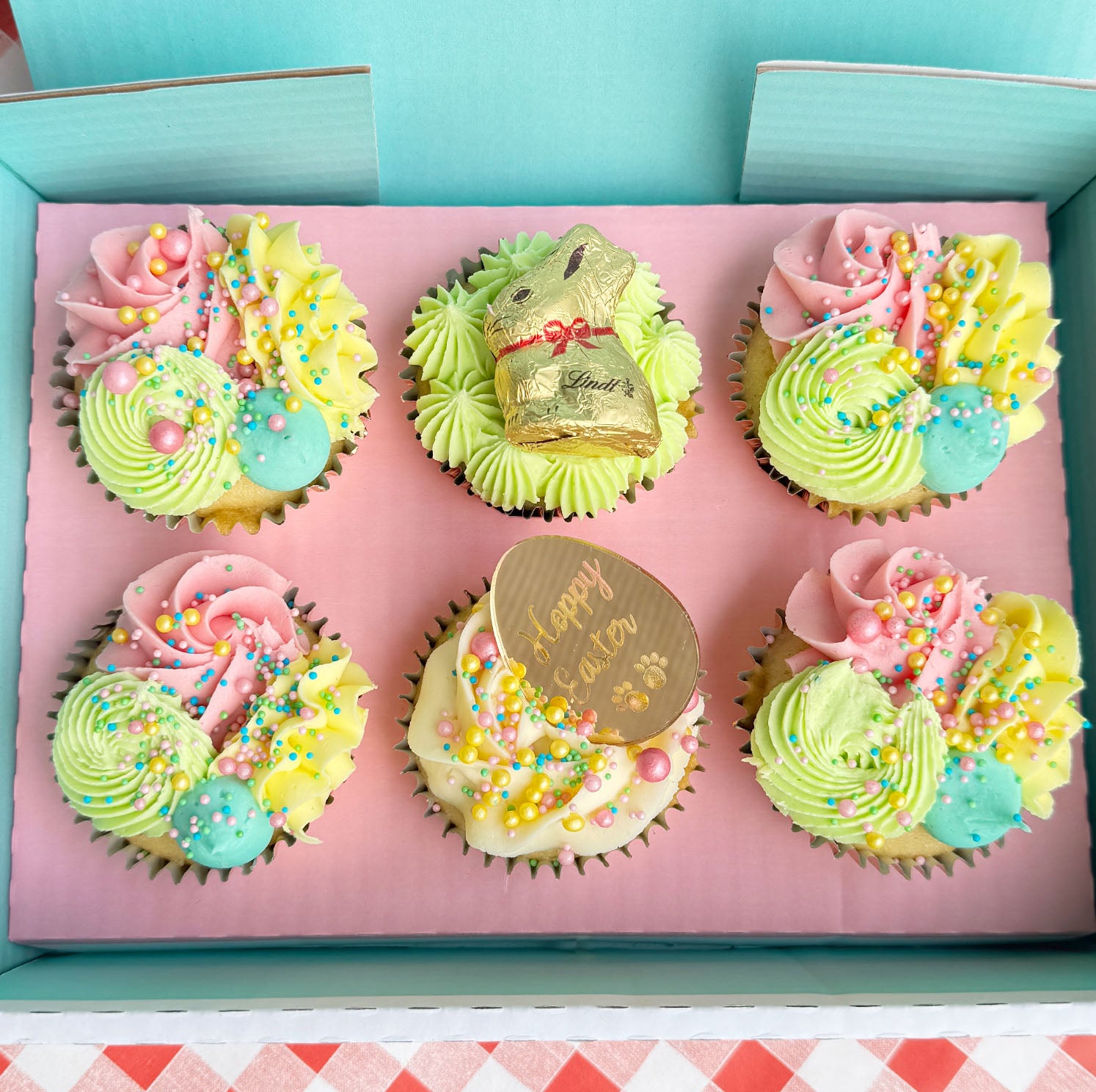 Each freshly baked cupcake is topped with smooth vanilla buttercream, swirled in soft pastel shades of yellow, green, blue and pink. Finished with delicate pastel pearl sprinkles, a mini Lindt Chocolate Bunny, and a keepsake gold mirror acrylic “Hoppy Easter” charm to make the day feel even more special.