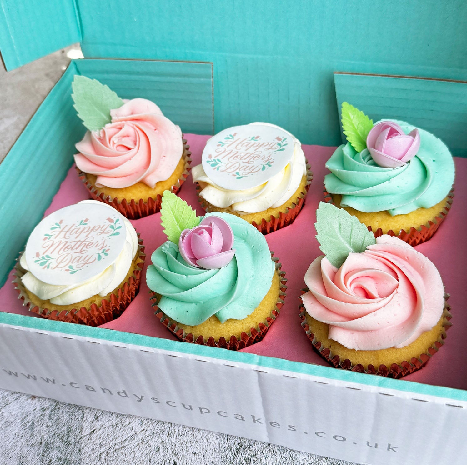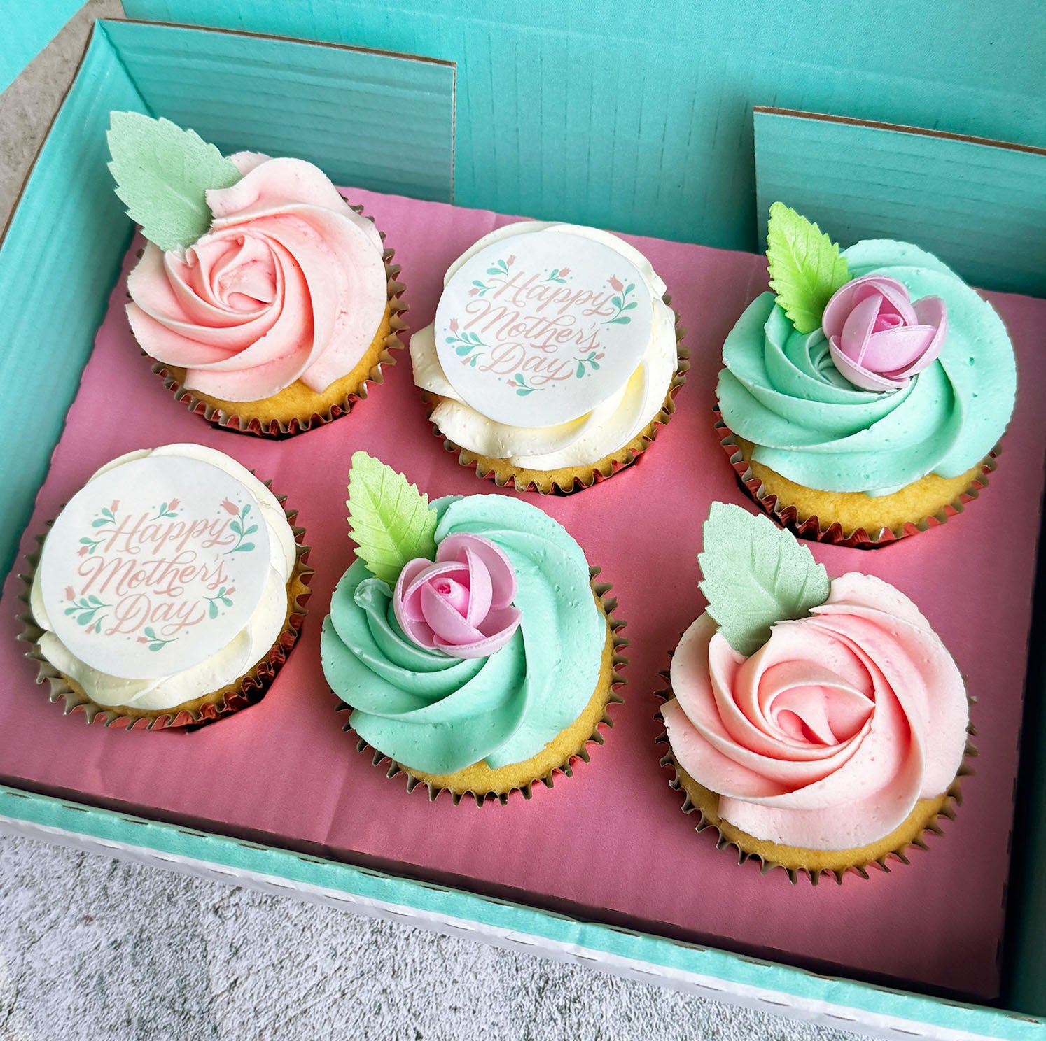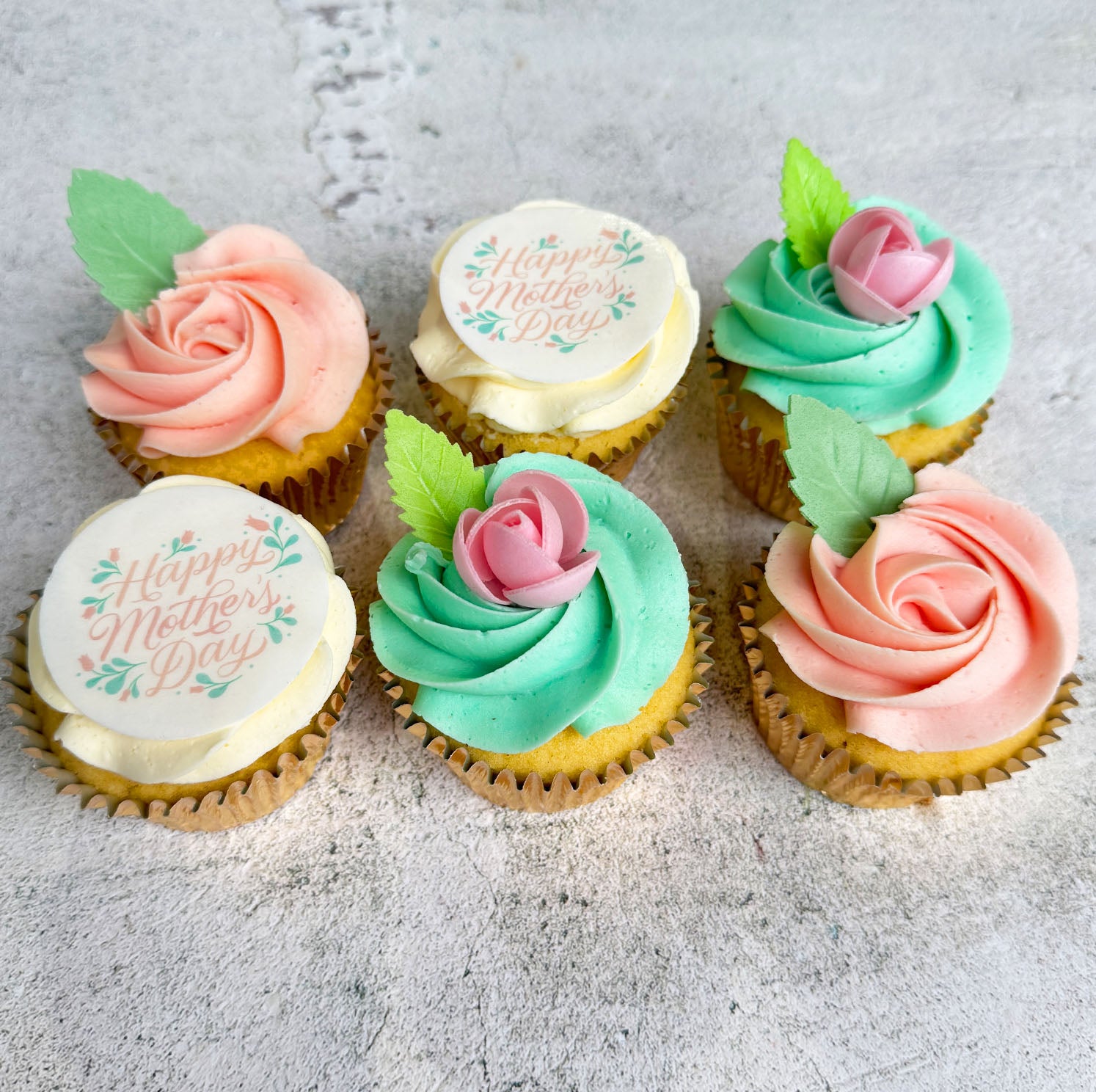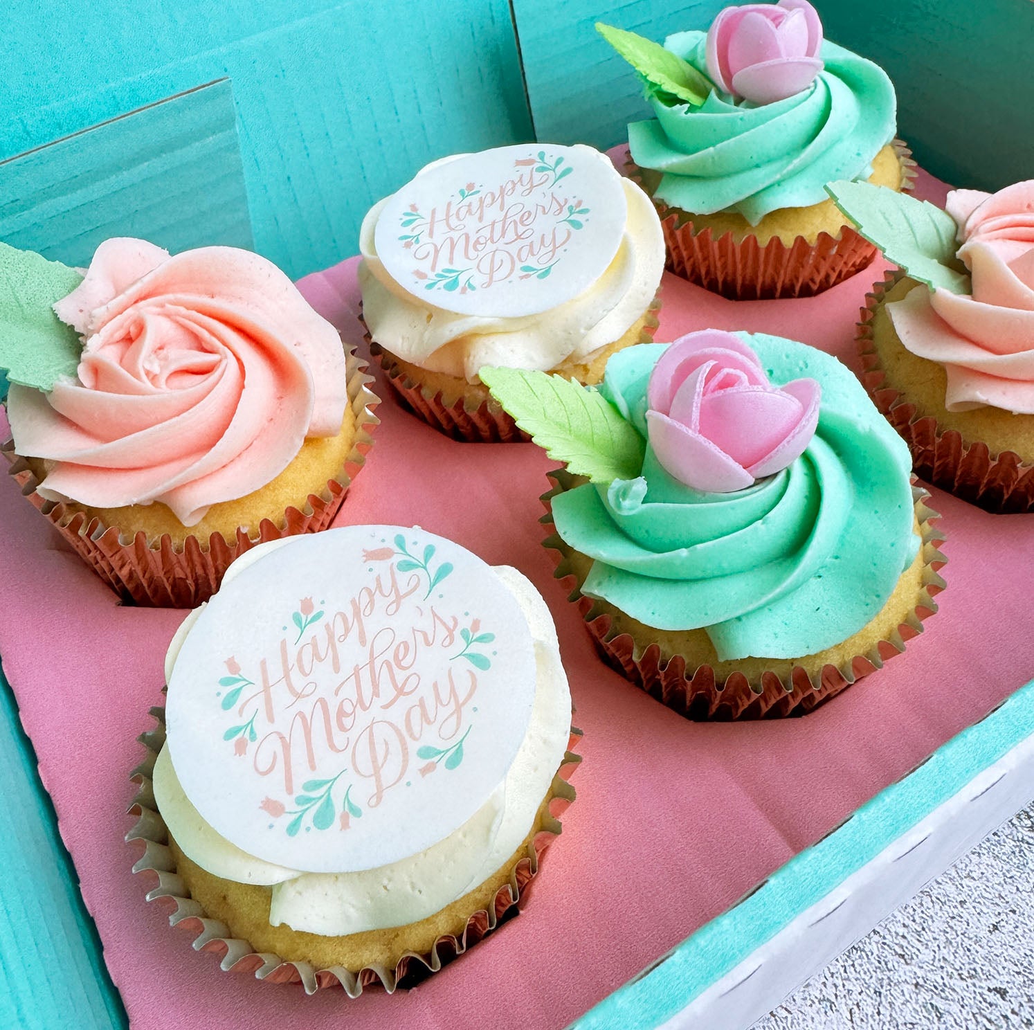- 2x cupcakes decorated with a vanilla buttercream swirl and an edible "Happy Mother's Day" wafer card topper (per 6 cupcakes)